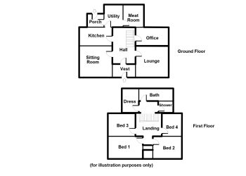 Ground Floor: Entrance Vestibule, Hallway, Lounge, Sitting Room/Dining Room, Kitchen, Utility Room, Meat Room, Office/Whisky Room, Rear Porch. First Floor: Landing, Bedroom One with Office, Bedroom Two, Bedroom Three, Bedroom Four, Dressing Room, Bathroom, Shower Room.