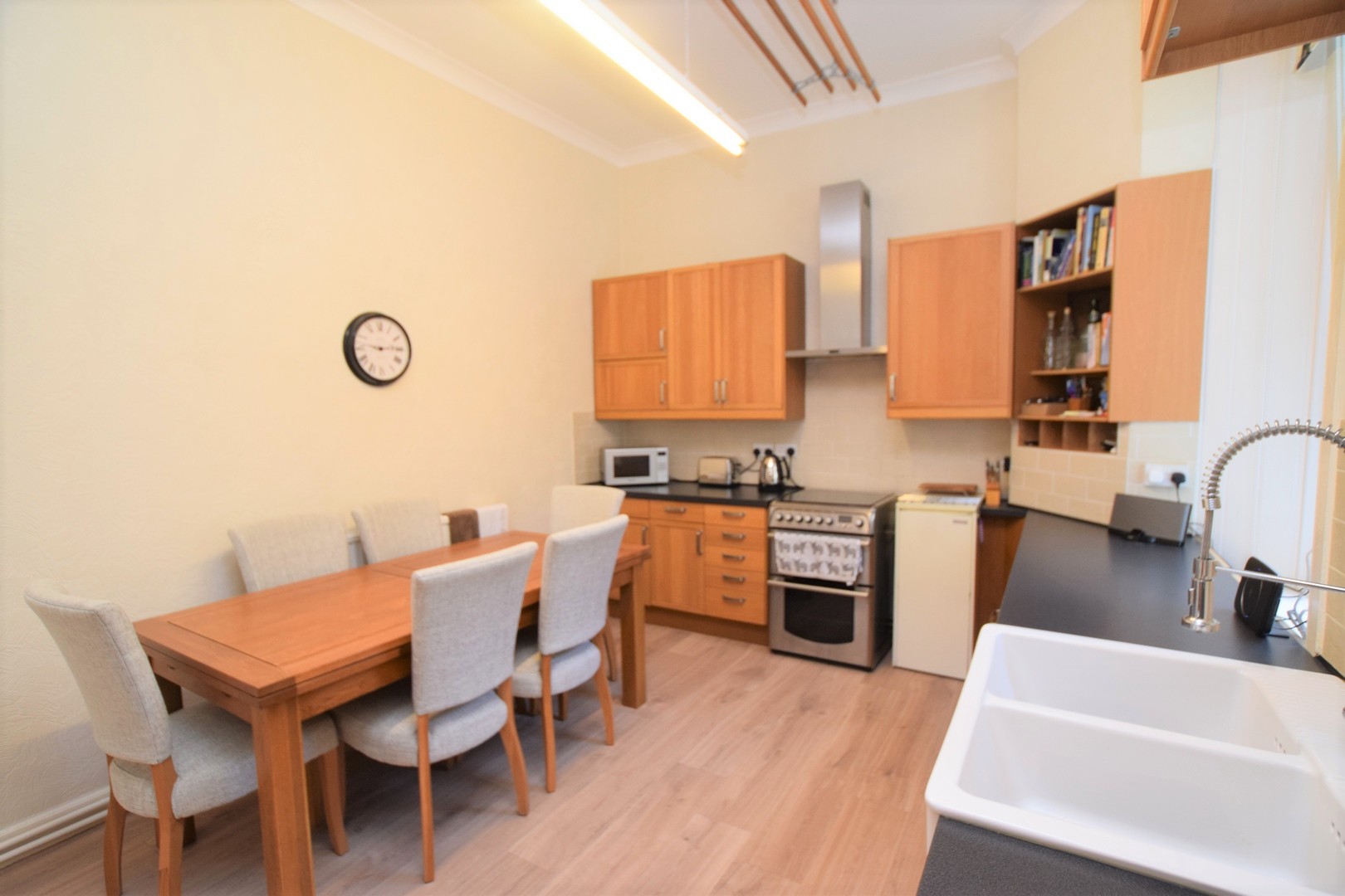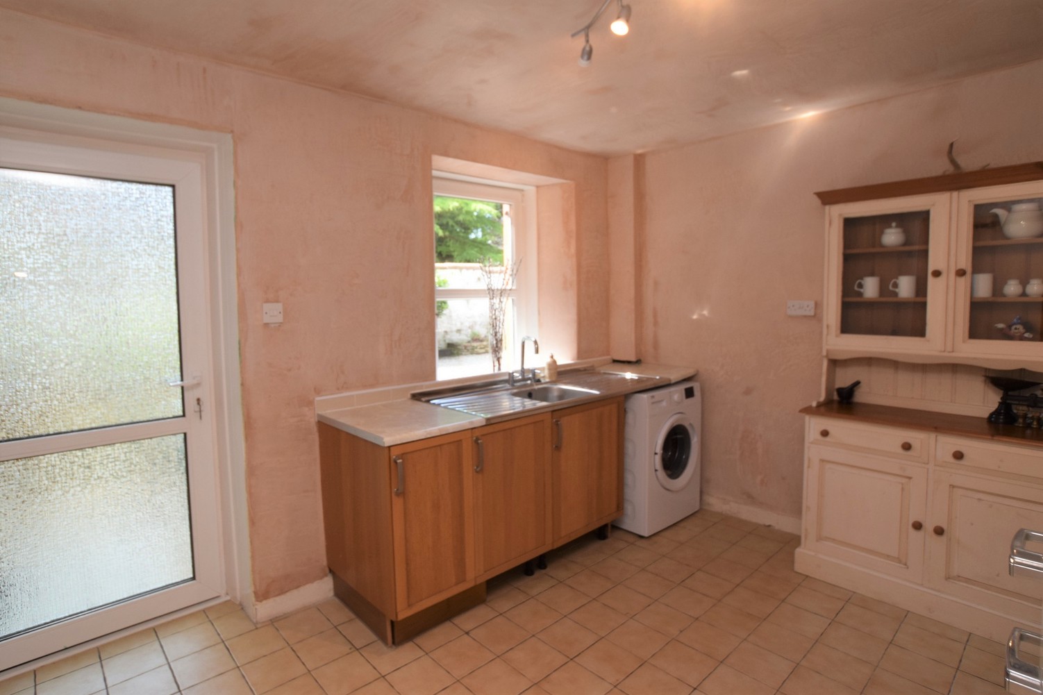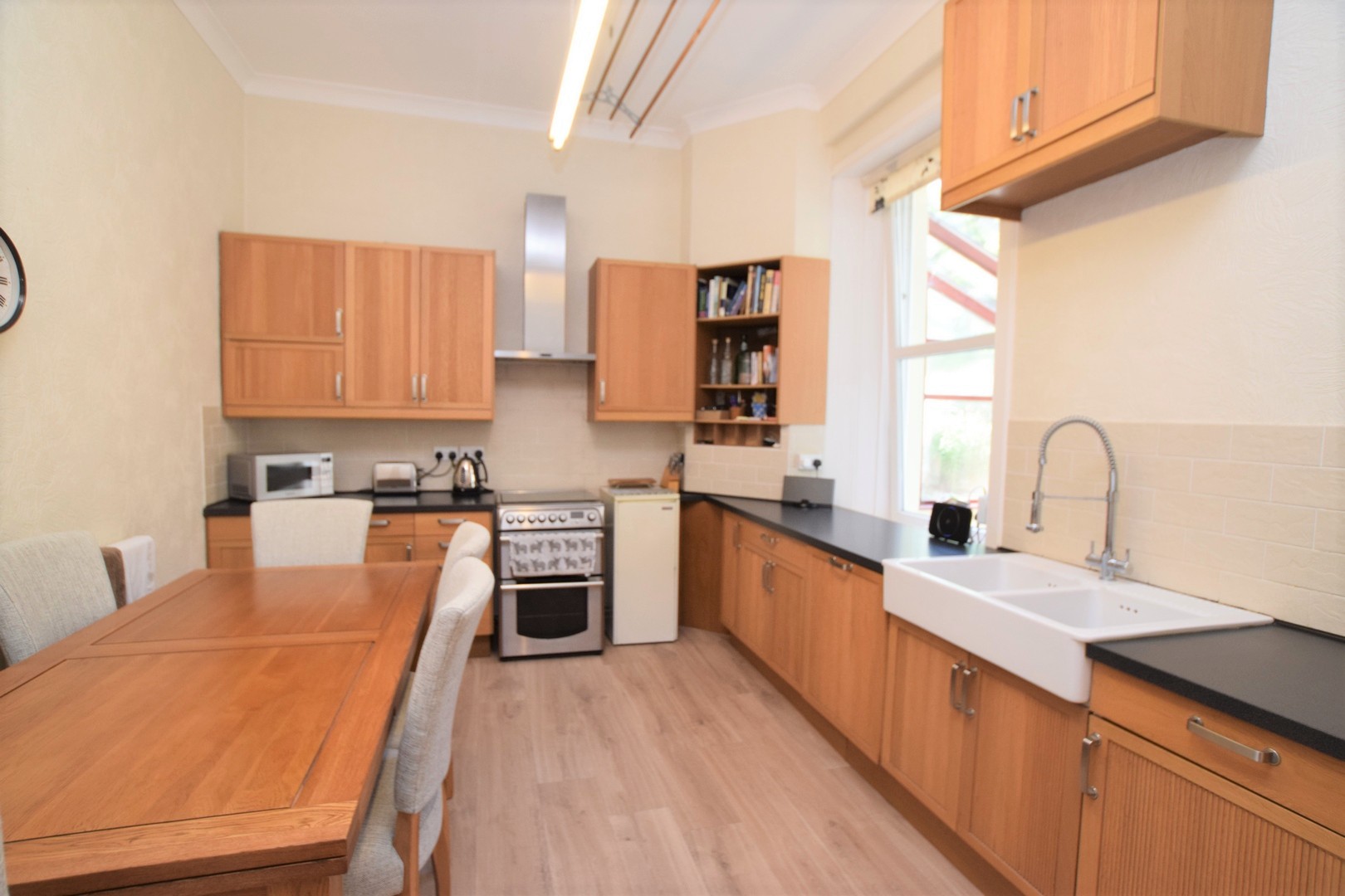 Kitchen 4.88m x 3.72m Double glazed window. Vinyl flooring. Range of fitted base and wall units with ample worktop surfaces, double bowl Belfast sink. Space for free standing cooker and dining table. Extractor hood. Drying pulley. Built-in corner cupboard. Smoke detector. Broadband point. Radiator. Ceiling light.