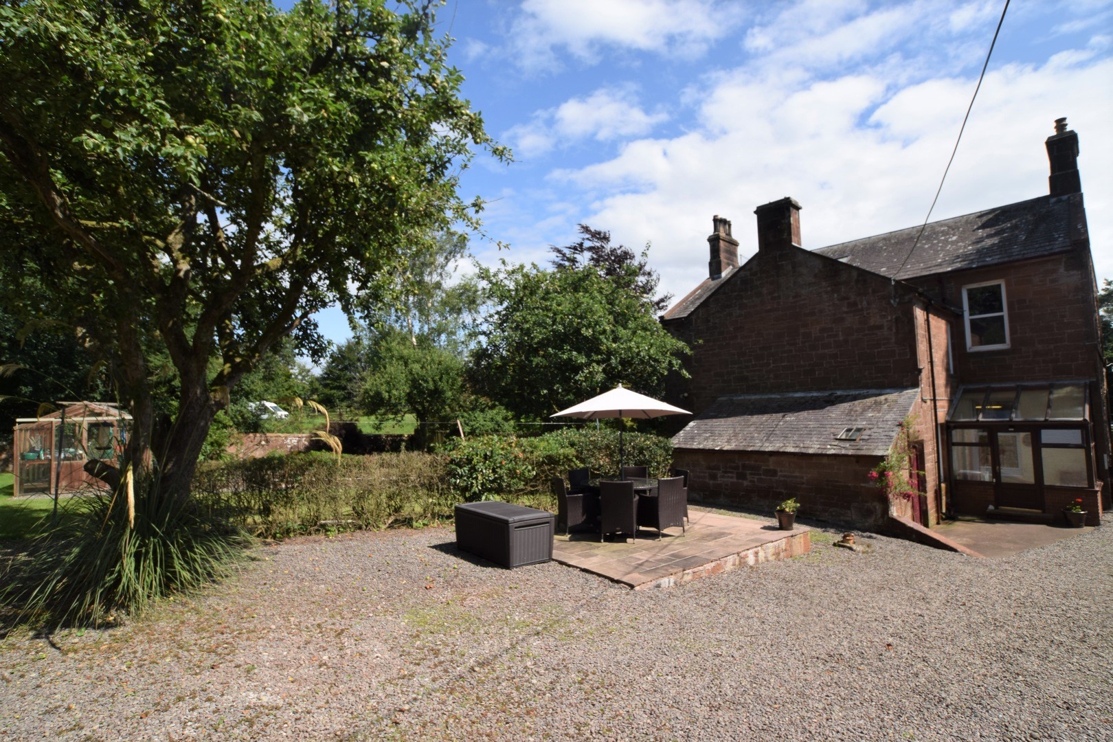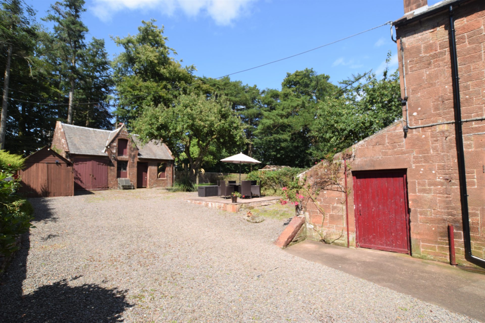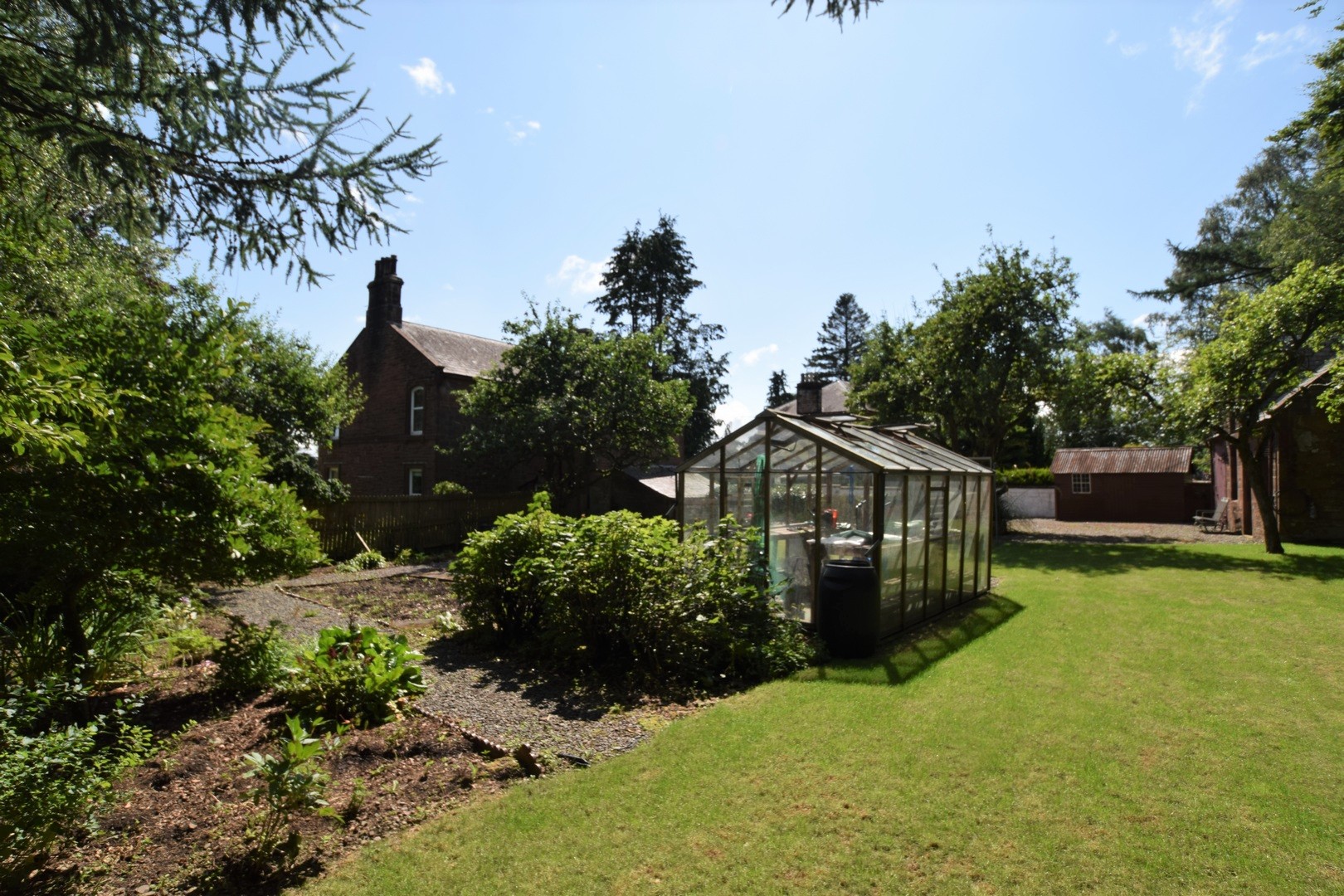 Outside Large Driveway, Garden grounds front, side & rear. Coach House & Stables, Greenhouse, Vegetable plot. Concrete base for shed/summer house with armoured cable under lawn.