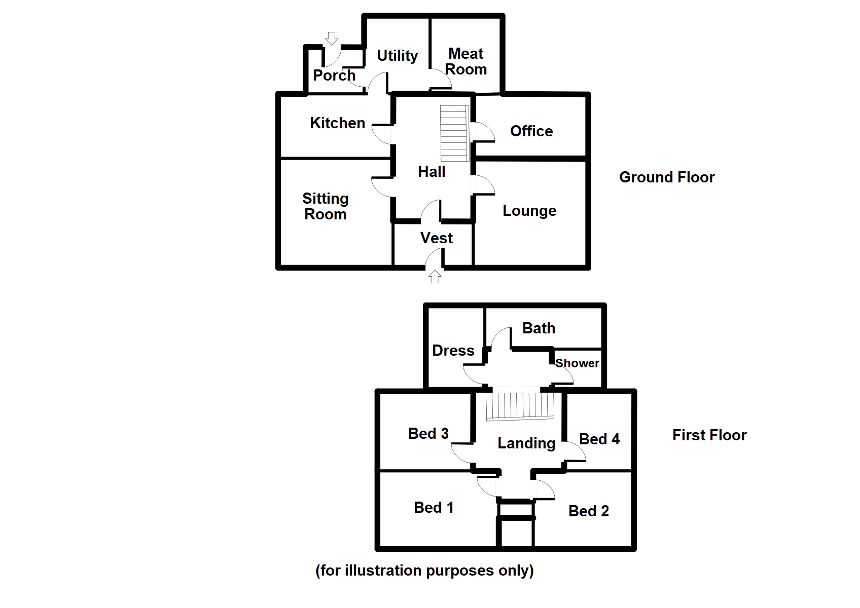 Ground Floor: Entrance Vestibule, Hallway, Lounge, Sitting Room/Dining Room, Kitchen, Utility Room, Meat Room, Office/Whisky Room, Rear Porch. First Floor: Landing, Bedroom One with Office, Bedroom Two, Bedroom Three, Bedroom Four, Dressing Room, Bathroom, Shower Room.