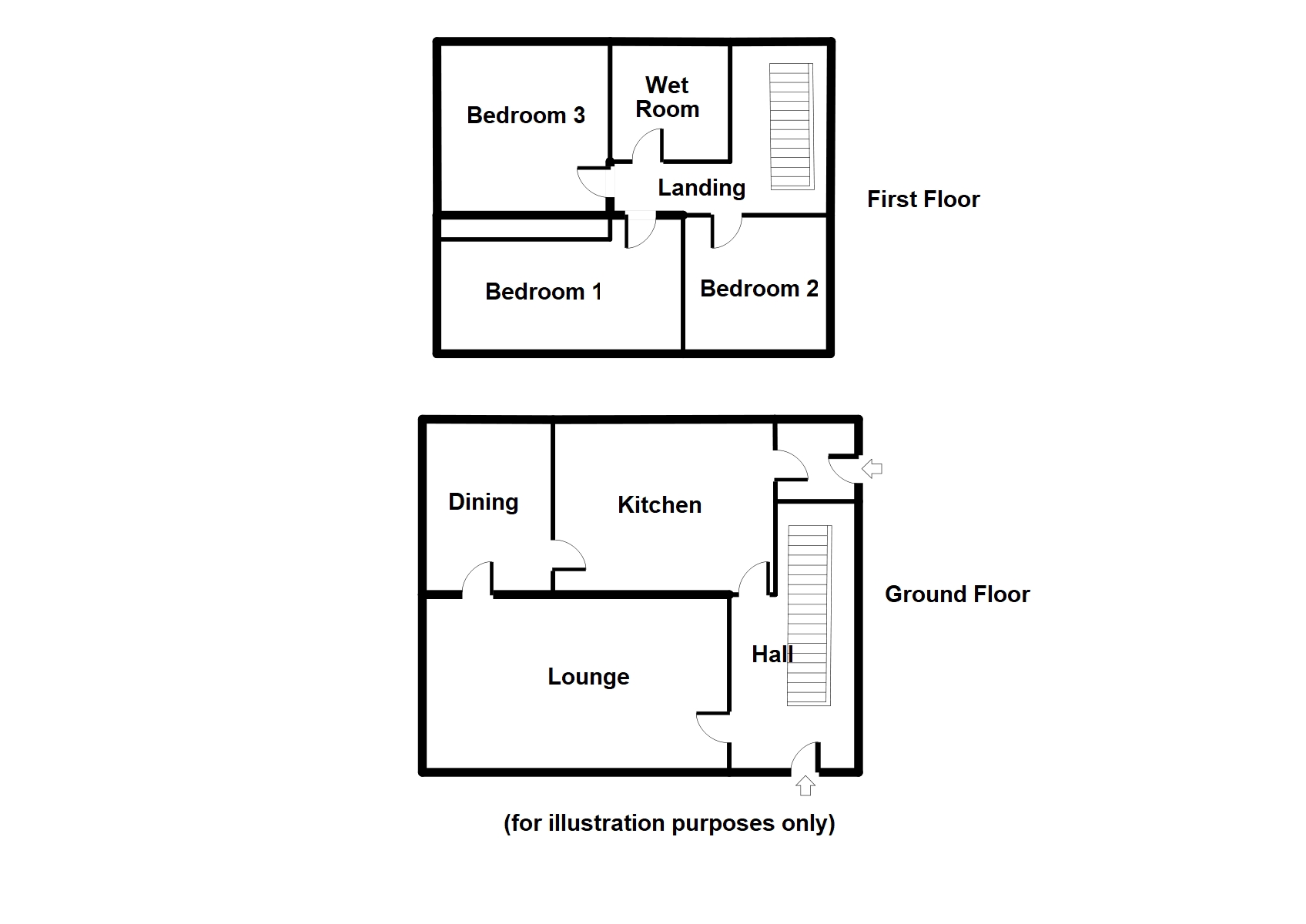 Ground Floor: Entrance Hallway, Lounge, Kitchen, Dining Room. First Floor: Landing, Bedroom 1, Bedroom 2, Bedroom 3, Wet Room.