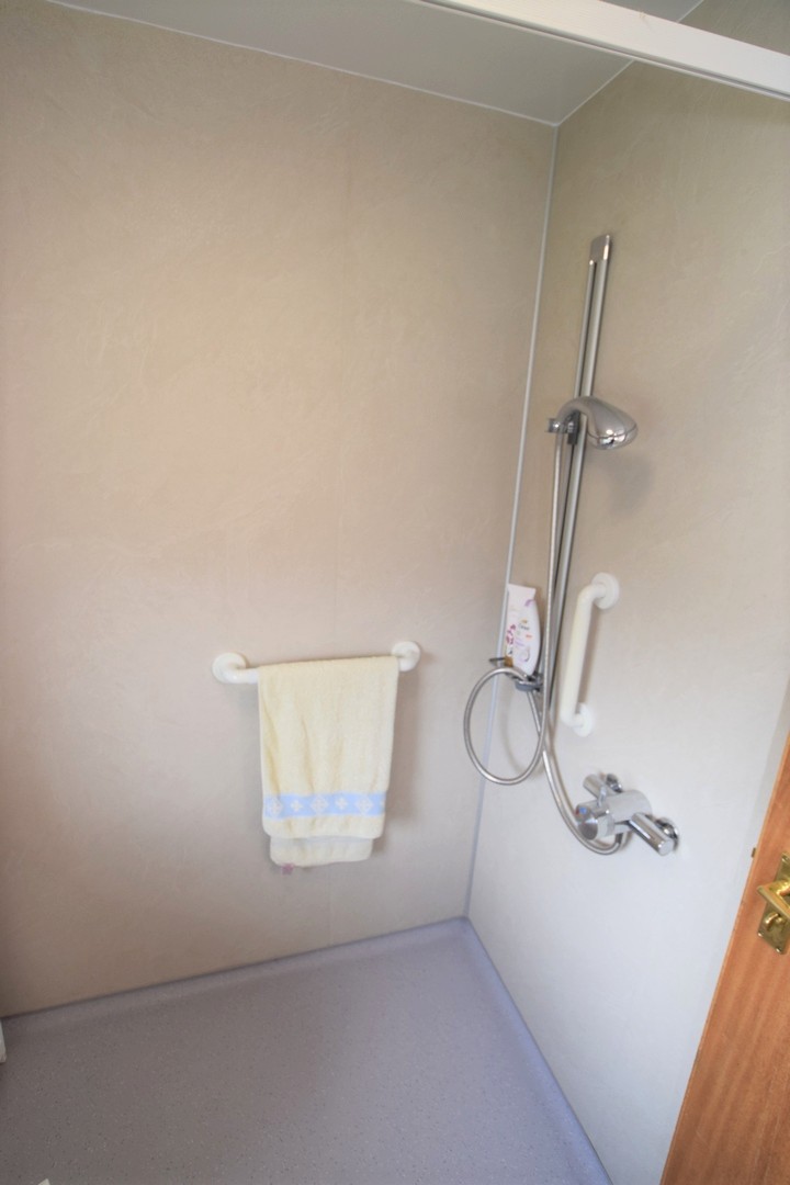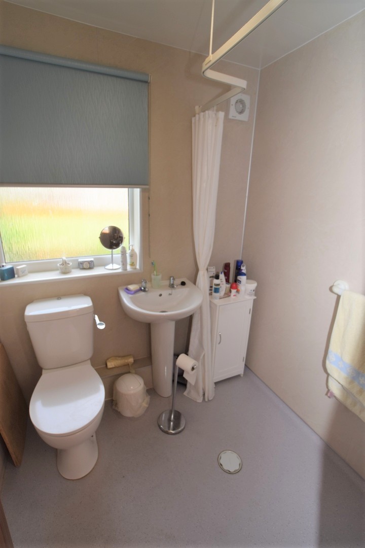 Double glazed window with fitted roller blind. Wash hand basin. WC. Grab rails. Wet room flooring. Mains powered shower. Shower curtain. Extractor fan. Ceiling lights.
