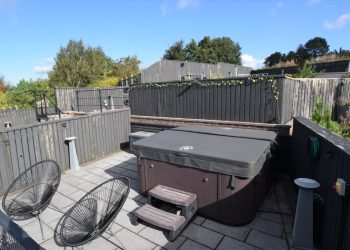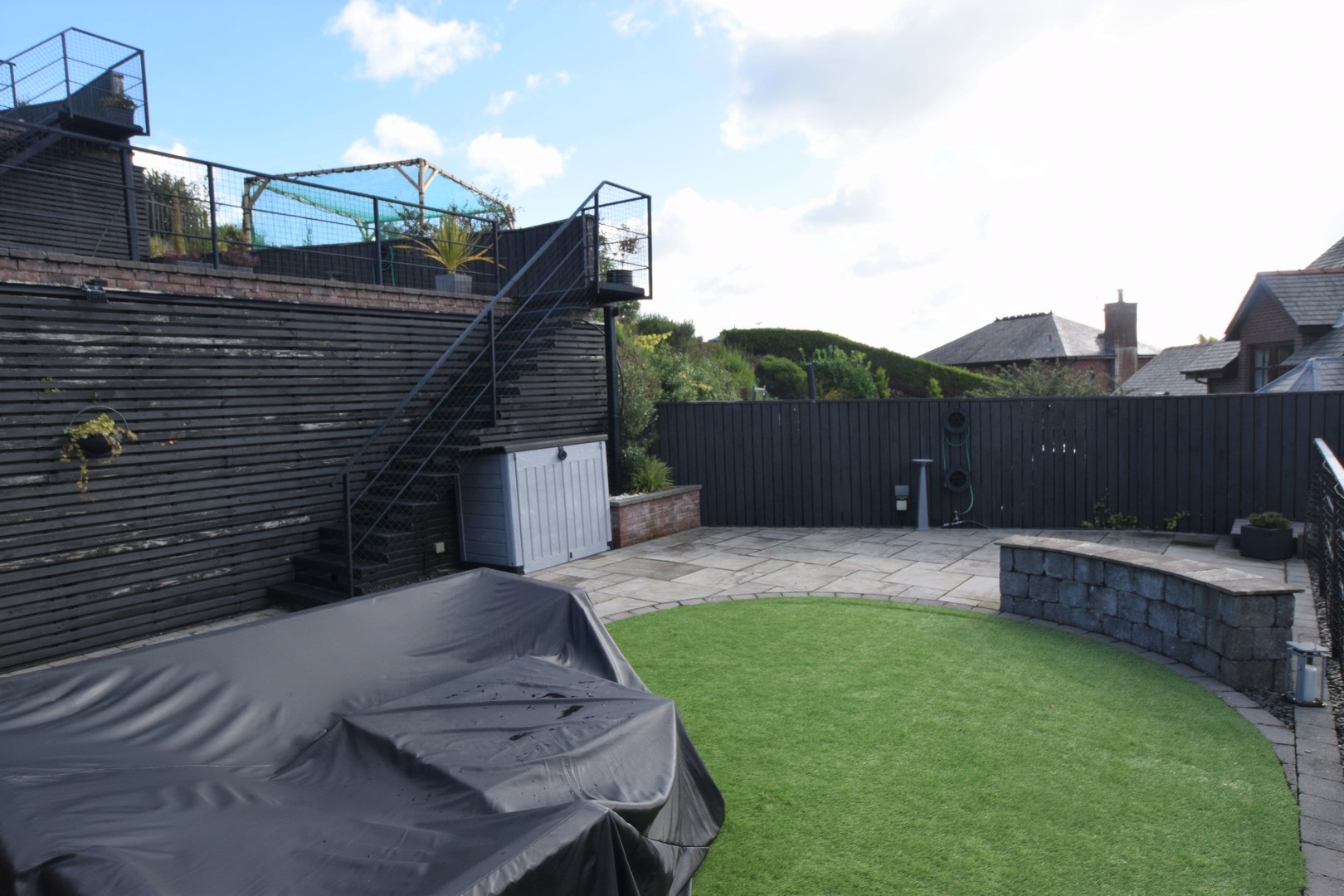Driveway. Lawn. Chipped stones. Rear garden on 4 levels. Indian sandstone patio areas. Hot Tub.