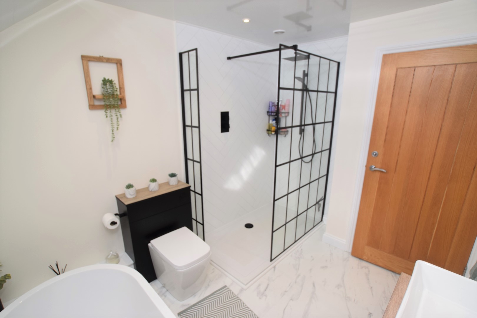 Double glazed window. Tiled floor. Walk-in shower enclosure. Illuminated LED audio bathroom mirror (music system). Mains powered shower with high quality hose. WC and wash hand basin. Heated towel rail. Respatex wall panels. Vanity unit. Extractor fan.