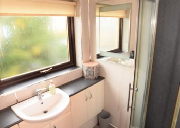 Double glazed window. Corner shower cubicle with Mira shower. Wash hand basin/vanity unit. Respatex wall panels. Vinyl flooring. WC. LED mirror. Extractor fan. Heated towel rail. Ceiling lights.