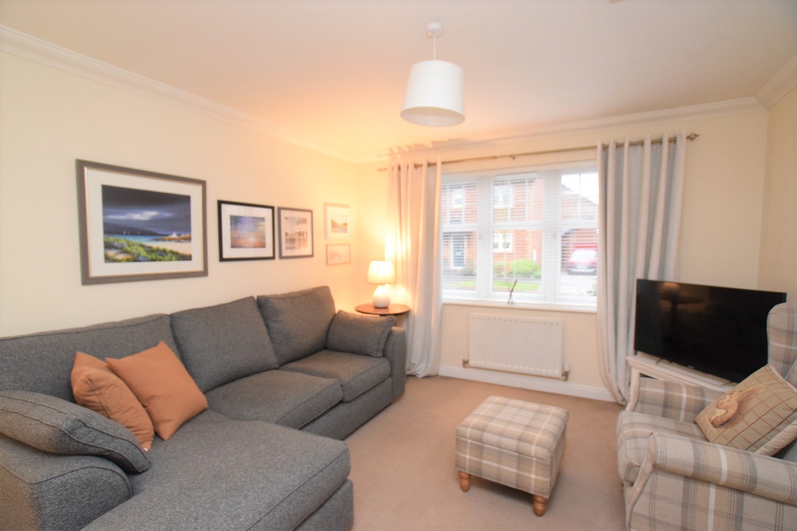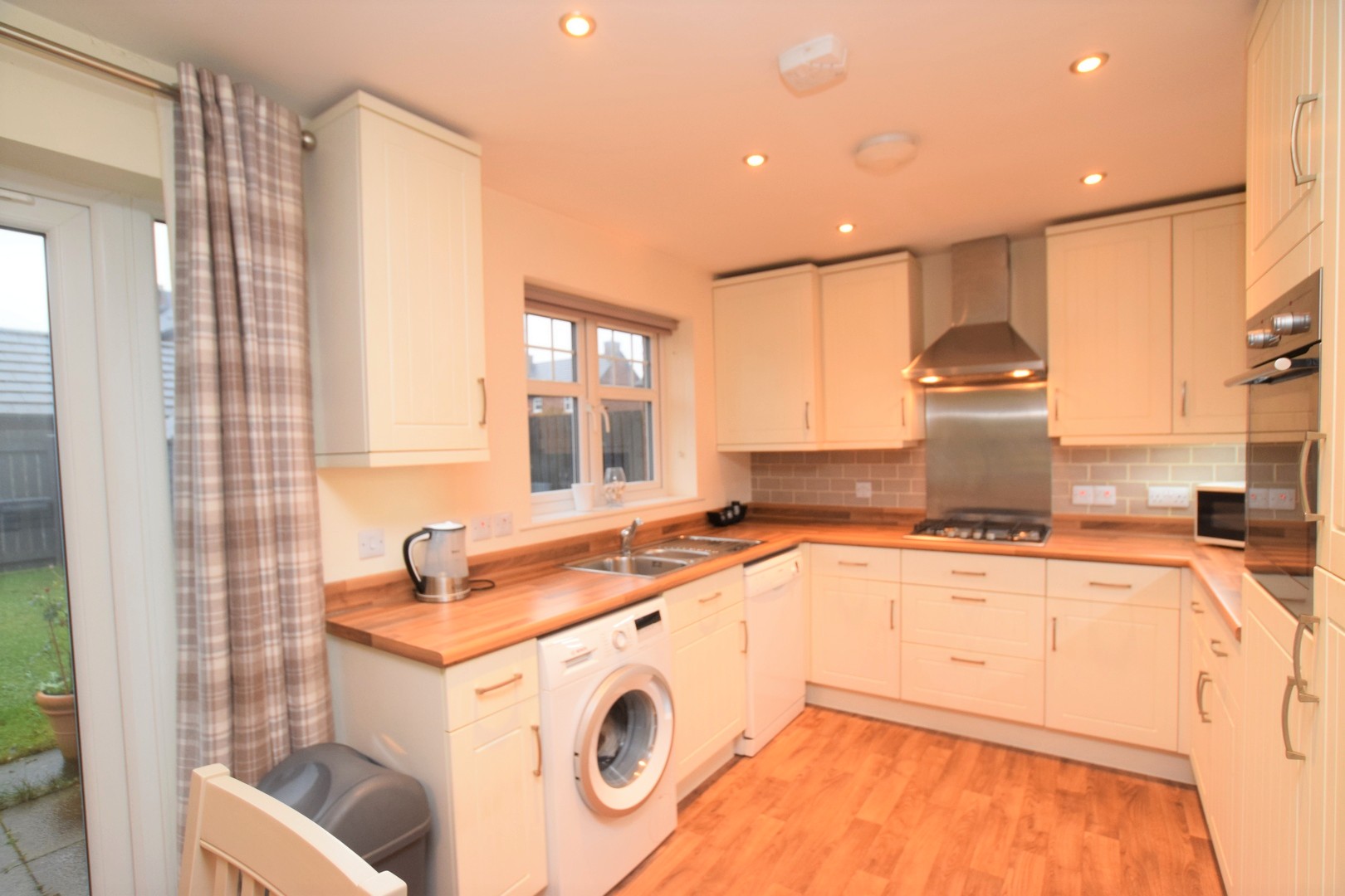 Double glazed windows with fitted roller blind. Double glazed patio doors to rear garden. Range of fitted base and wall units with ample worktop surfaces. Integrated AEG oven and grill, AEG 4 burner gas hob, fridge freezer, Vaillant gas combi boiler, stainless steel sink and drainer. Space for washing machine and dishwasher. Extractor fan. Smoke detector. Carbon monoxide detector. Radiator. LED spot lighting.