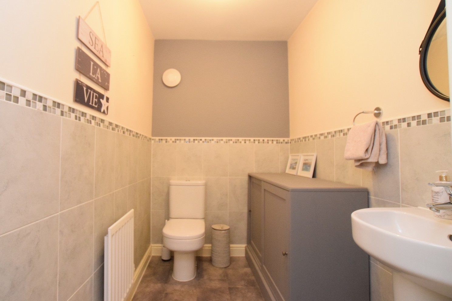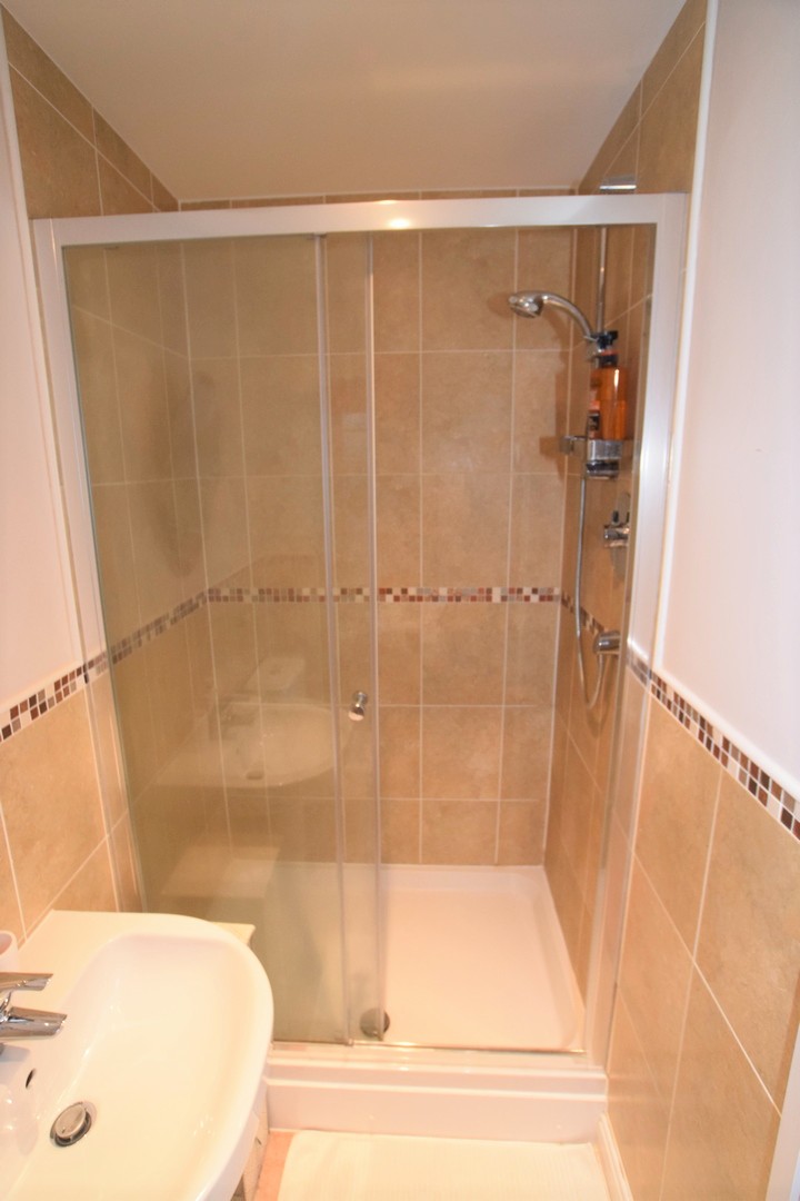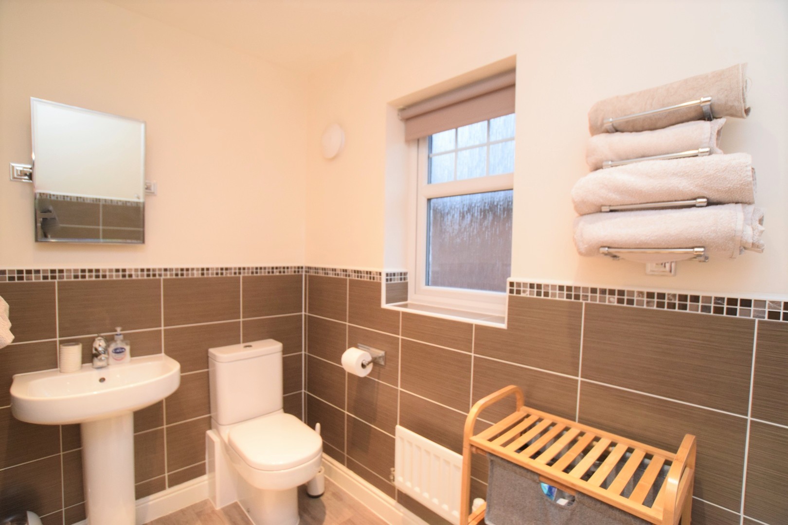 Wash hand basin. WC. High quality vinyl flooring. Tiled walls. Shaving point. Extractor fan. Radiator. Ceiling light.