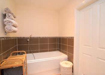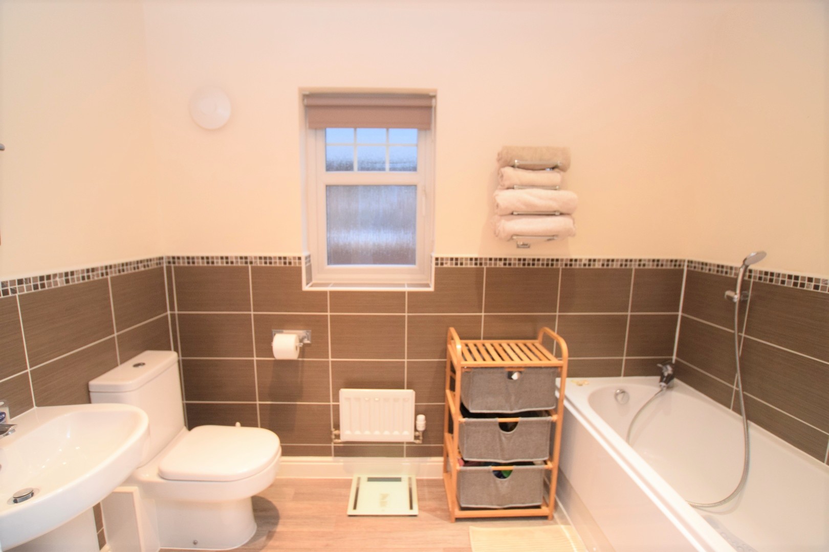 Double glazed window with fitted roller blind. Wash hand basin. WC. Bath with shower hose. High quality vinyl flooring. Tiled walls. Shaving point. Mirror. Towel holders. Extractor fan. Radiator. LED spot lighting.