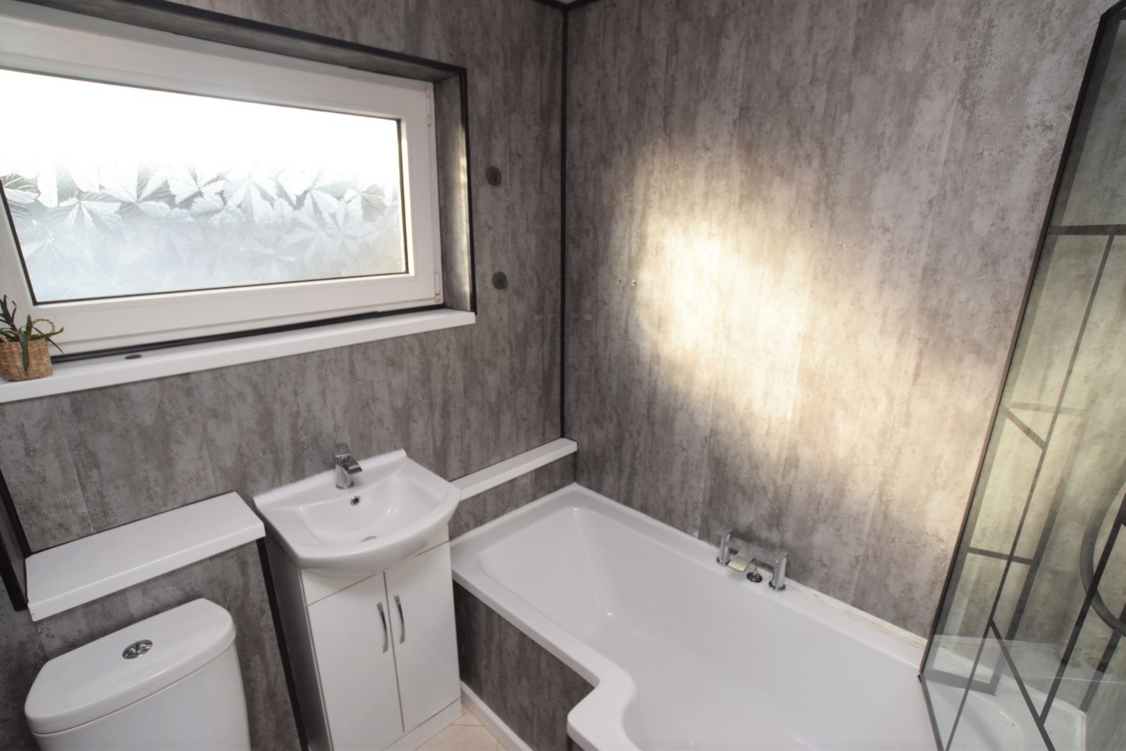 Double glazed window. Respatex wall panels. Wet room floor tiles. Bath with shower screen. Electric Mira shower. Vanity unit and wash hand basin. WC. Heated towel rail. Ceiling light.