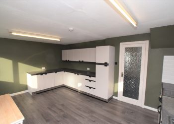 Double glazed windows with fitted roller blinds. UPVc door to rear garden. Laminate flooring. Range of fitted base and wall units with ample worktop surfaces. Stainless steel sink. Free standing cooker. Space for dining table, washing machine and fridge freezer. Tiled splashback. Smoke detector. Radiator. Ceiling lights.