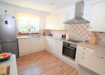 uPVC double glazed window to rear with roller blind; recessed spotlights; heat detector; cream wall and base kitchen units with marble effect worktops and tiled splash backs; stainless steel sink and drainer; integral AEG electric oven and integral ZANUSSI electric hob with ZANUSSI extractor hood over; ceiling extractor fan; SAMSUNG fridge freezer; radiator; laminate flooring