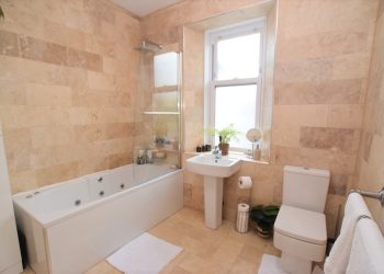 Bathroom 2.65m x 2.53m Double glazed sash and case window. Tiled floor (under floor heating) and walls. Jacuzzi bath. Mains powered shower. Wash hand basin. WC. Floor to ceiling store unit. Extractor fan. Radiator. Ceiling light.